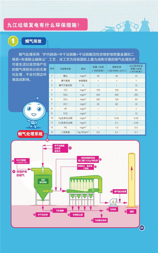 據(jù)介紹,九江垃圾焚燒發(fā)電項目煙氣凈化工藝采用“SNCR脫硝+半干法脫酸+干法脫酸+活性炭吸附+布袋除塵+煙氣再循環(huán)”的組合工藝技術(shù),達(dá)到并優(yōu)于歐盟2010標(biāo)準(zhǔn)。滲濾液和其他廢水處理達(dá)標(biāo)后全部廠內(nèi)回用。年供綠色電能3億度,節(jié)約標(biāo)準(zhǔn)煤12萬噸/年,二氧化碳減排2.5萬噸/年,COD減排1.5萬噸/年。