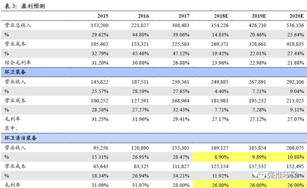 環(huán)衛(wèi)裝備:2018/2019/2020年?duì)I收增速:1)環(huán)衛(wèi)清潔裝備8.90%/9.80%/10.88%;垃圾收轉(zhuǎn)裝備0.98%/2.96%/3.95%;3)新能源環(huán)衛(wèi)裝備-28.60%/-8.20%/12.20%。2018/2019/2020年毛利率:1)環(huán)衛(wèi)清潔裝備26%/26%/26%;2)垃圾收轉(zhuǎn)裝備30%/30%/30%;3)新能源環(huán)衛(wèi)裝備27%/27%/27%。