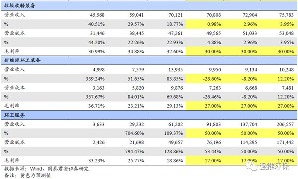 環(huán)衛(wèi)服務(wù):2018/2019/2020年?duì)I收增速:50%/50%/50%;2018/2019/2020年毛利率:17%/17%/17%。