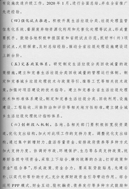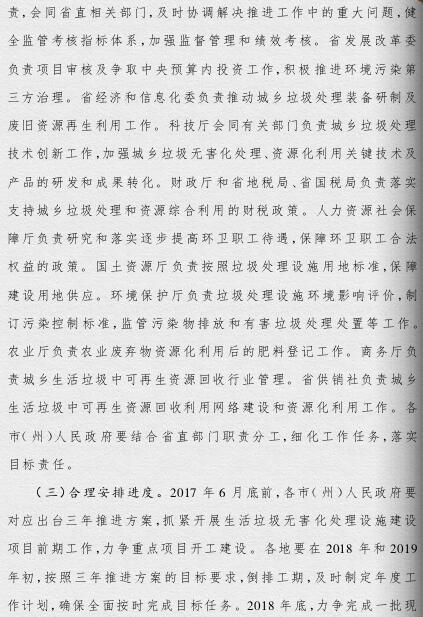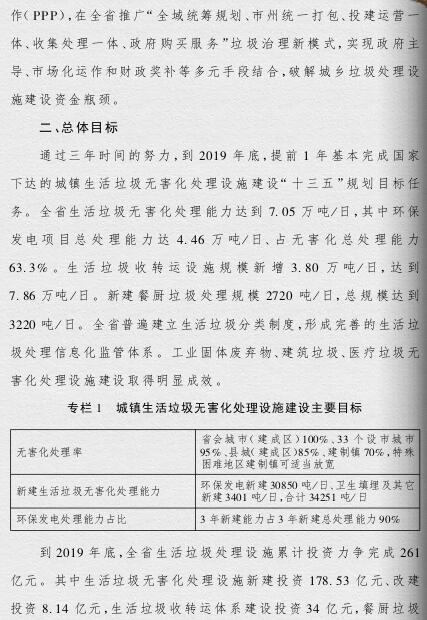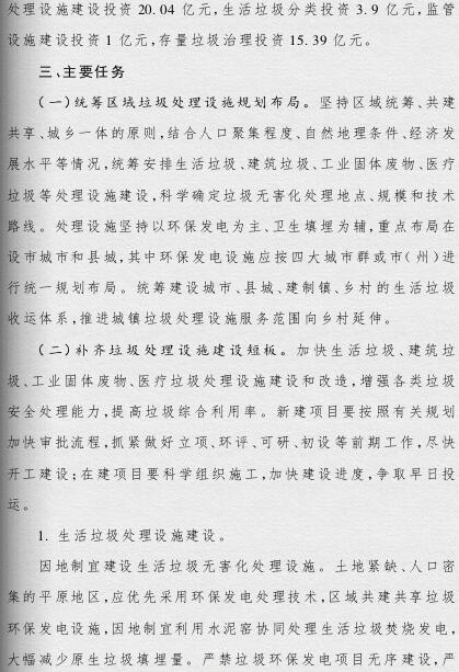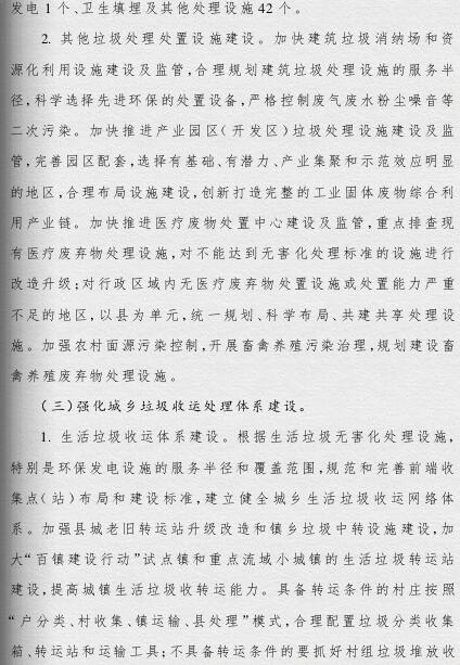 《方案》提出,要根據(jù)人口聚集程度、自然地理?xiàng)l件、經(jīng)濟(jì)發(fā)展水平等情況統(tǒng)籌規(guī)劃布局垃圾處理設(shè)施建設(shè);要補(bǔ)齊垃圾處理設(shè)施建設(shè)短板,到2019年底,新建生活垃圾無害化處理設(shè)施76座,完成無害化處理設(shè)施改擴(kuò)建43個(gè)和存量垃圾治理項(xiàng)目62個(gè)。