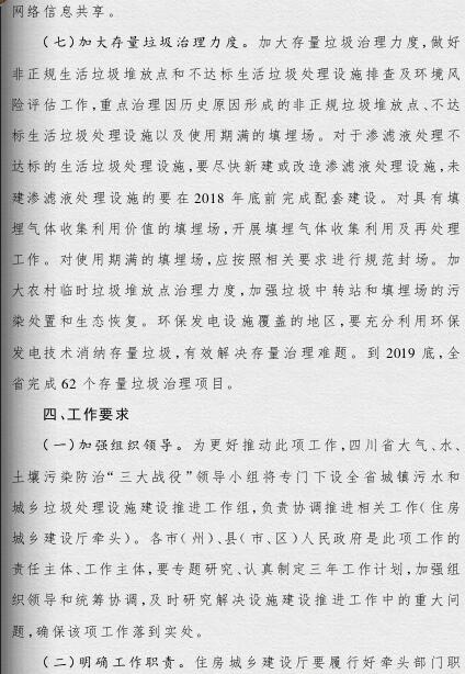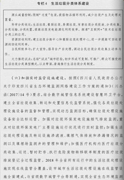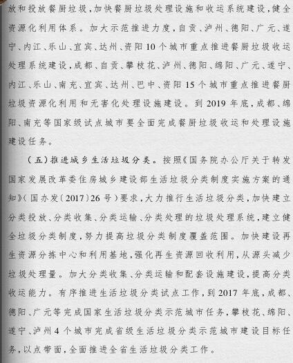 四川省政府印發(fā)了《四川省城鄉(xiāng)垃圾處理設(shè)施建設(shè)三年推進(jìn)方案》(以下簡(jiǎn)稱《方案》)?!斗桨浮诽岢?,到2019年底,我省生活垃圾無害化處理能力將達(dá)7.05萬(wàn)噸/日,生活垃圾處理設(shè)施累計(jì)投資力爭(zhēng)完成361億元,普遍建立生活垃圾分類制度,形成完善的生活垃圾處理信息化監(jiān)管體系。