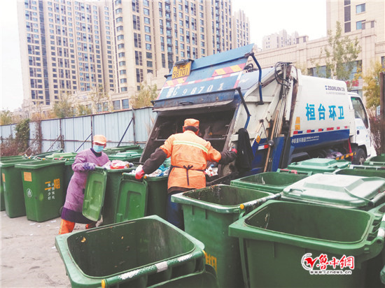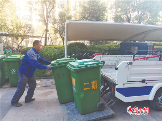 5日早晨7點(diǎn)10分,桓臺(tái)東岳國(guó)際9號(hào)樓1單元的居民王女士把一袋垃圾提到樓下,扔進(jìn)了樓前的垃圾桶。第一個(gè)處理這袋垃圾的人,是東岳國(guó)際物業(yè)的保潔馬師傅。每天早上7點(diǎn)30分上班后,馬師傅和同事開(kāi)著一輛專(zhuān)用的四輪電動(dòng)車(chē),把垃圾桶從居民樓前運(yùn)到小區(qū)外面的臨時(shí)垃圾存放點(diǎn)。東岳國(guó)際小區(qū)有23棟樓,每個(gè)單元前面都擺著兩三個(gè)垃圾桶。馬師傅他們上午要拉四趟,下午拉一趟就可以了,“住在這個(gè)小區(qū)里的年輕人多,白天都上班了,產(chǎn)生的垃圾也少。”馬師傅告訴記者。