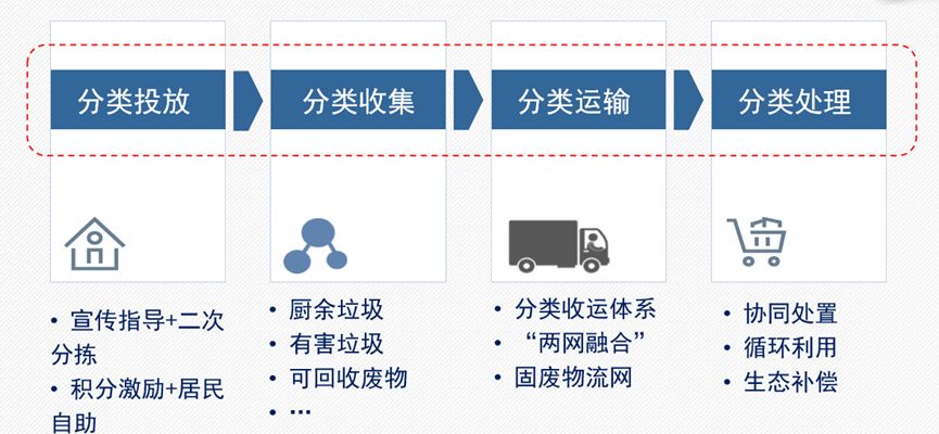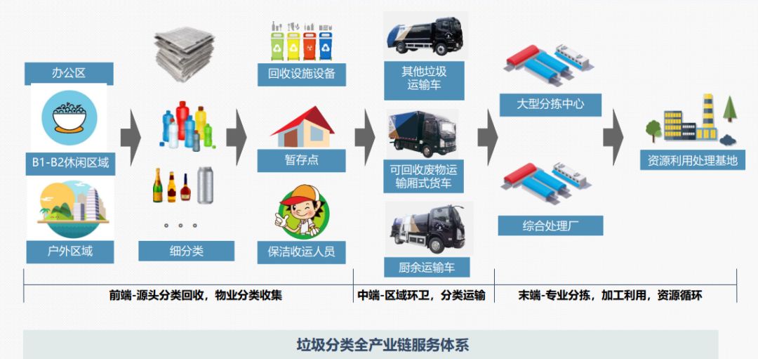集團(tuán)按照分類投放、收集、運(yùn)輸、處理全過程進(jìn)行分類構(gòu)建與全產(chǎn)業(yè)布局,實際上是把固體廢物進(jìn)行分類收集與分類運(yùn)輸,按照“大分流,細(xì)分類”的思路,對垃圾進(jìn)行分類,實現(xiàn)全域固廢綜合管理。