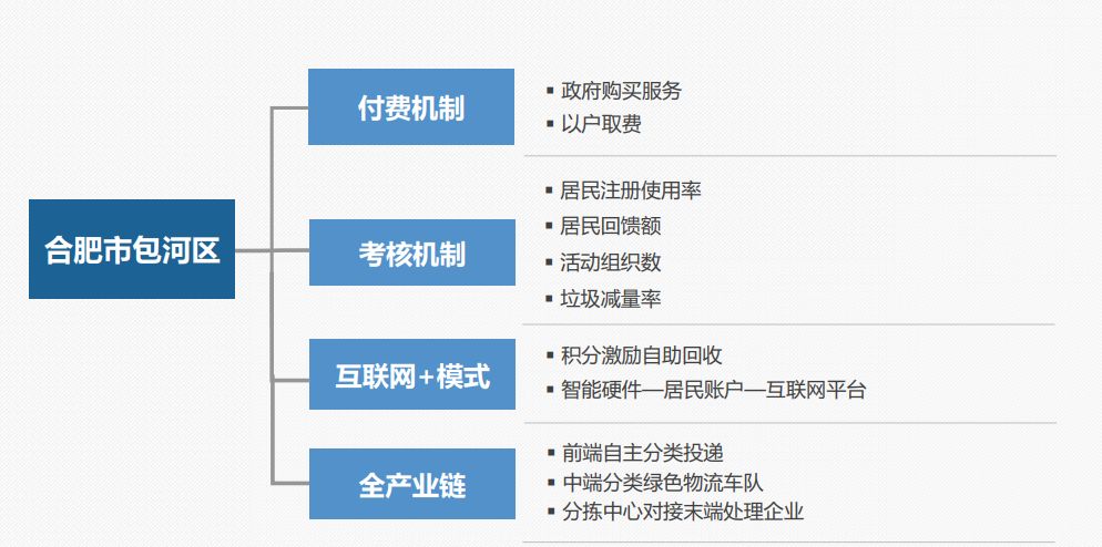 目前北京的16個區(qū)中我們已經(jīng)在8個區(qū)中開展了工作,除此之外,2017年1月,中標(biāo)合肥市包河區(qū)生活垃圾分類項目,該項目主要服務(wù)包河區(qū)10萬戶的居民垃圾分類服務(wù)工作。付費機(jī)制是政府購買服務(wù),按戶進(jìn)行收費,每戶280塊錢。還有一套考核機(jī)制,根據(jù)居民注冊使用率、居民回饋額、活動組織數(shù)、垃圾減量率進(jìn)行考核與反饋。