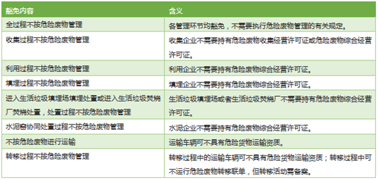 注:上表依據(jù)《危險廢物豁免管理清單》及《環(huán)境資源犯罪實務精釋》(喻海松著,2017年1月版,法律出版社,P136~137)編輯、整理