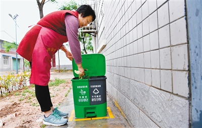 雖然下著雨,但何村社區(qū)滿眼綠樹紅花、處處干凈整潔。村民崔玉玲在自己家中,系著印有“垃圾分類 從我做起”的圍裙,從冰箱取出蔬菜,擇洗完畢后,熟練地拿著要丟棄的菜葉子,扔進(jìn)了家門口大垃圾桶里標(biāo)著“可腐爛”字樣的綠色小桶里。