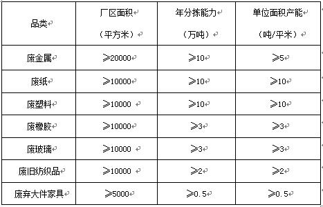 指分揀品類不少于二類,分揀能力和用地面積規(guī)劃設(shè)計(jì),應(yīng)以再生資源分揀用地標(biāo)準(zhǔn)和本區(qū)域再生資源實(shí)際產(chǎn)生量為準(zhǔn)??煞譃榇?、中、小型三個(gè)級別,各級別綜合型分揀中心的年分揀能力和廠區(qū)面積如下: