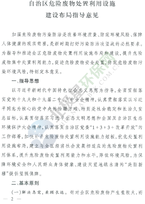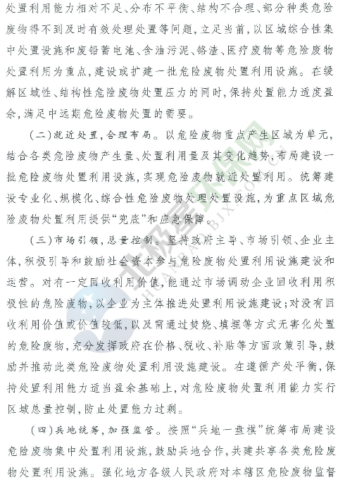 《指導意見》根據(jù)全區(qū)危險廢物產(chǎn)生、處置利用現(xiàn)狀和發(fā)展趨勢,以解決急需、兼顧長遠,就近處置、合理布局,市場引領、總量控制,兵地統(tǒng)籌、加強監(jiān)管為基本原則,通過優(yōu)化建設布局,擬用5年左右時間,解決目前全區(qū)危險廢物處置利用能力存在的結構性、布局性和相對不足問題,使全區(qū)危險廢物集中處置利用能力不斷增強,處置利用設施布局趨于合理,基本滿足我區(qū)產(chǎn)生的各類危險廢物安全處置利用的需求,不斷提升全區(qū)危險廢物污染防治水平,降低環(huán)境風險。