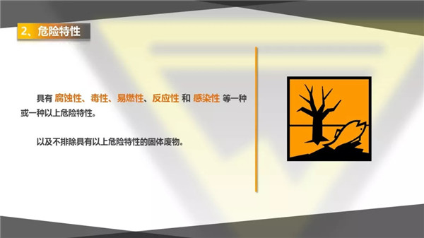 該定義包括兩個方面的含義,一是危險廢物屬于固體廢物的一部分(換言之,某種物質(zhì)如果不屬于固體廢物,那么該物質(zhì)肯定不屬于危險廢物);二是危險廢物必須具有危險特性,危險廢物的特性常見有五種,分別為毒性(包括浸出毒性、急性毒性、生物毒性等)、腐蝕性、易燃性、感染性、化學(xué)反應(yīng)性,具有一種或幾種危險特性的固體廢物屬于危險廢物。