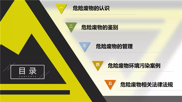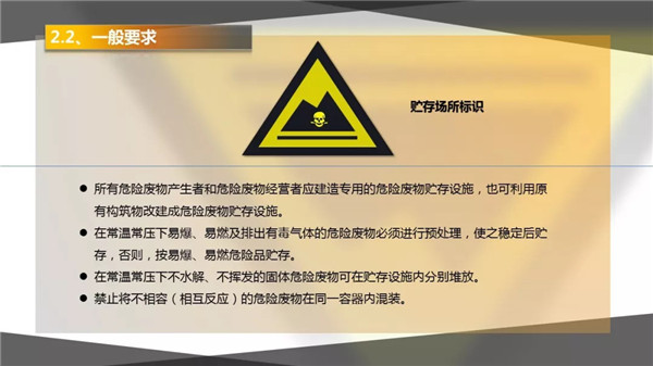 4危險廢物識別標志設(shè)置不規(guī)范或不設(shè)置。關(guān)于標志或標簽國際是有規(guī)定的,詳見:《環(huán)境保護圖形標志》(GB 15562.2)、《危險廢物貯存污染控制標準》(GB 18597)危險廢物倉庫門外的警告標志長這樣的啦~
