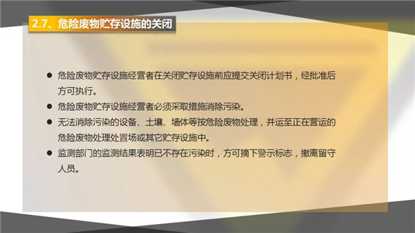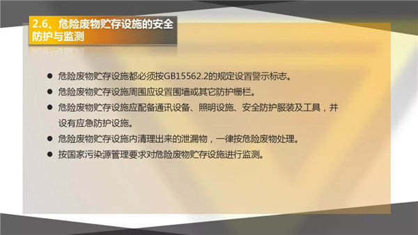 6其他注意事項:若危險廢物儲存場所會異味的,應(yīng)設(shè)施廢氣處理設(shè)施,確保廢氣達標排放;若儲存的為流質(zhì)或半流質(zhì)等易散落的危險廢物的,必須設(shè)施收集設(shè)施,如收集井。