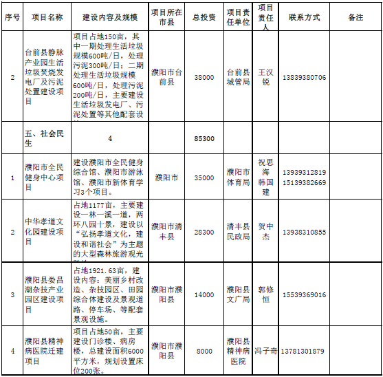 生態(tài)環(huán)保領(lǐng)域項(xiàng)目2個,總投資115600萬元,主要包括濮陽縣靜脈產(chǎn)業(yè)園項(xiàng)目、臺前縣靜脈產(chǎn)業(yè)園生活垃圾焚燒發(fā)電廠及污泥處置建設(shè)項(xiàng)目。