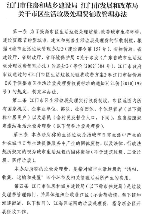 日前, 廣東江門市住建局發(fā)布了關(guān)于征求對《關(guān)于市區(qū)生活垃圾處理費征收管理辦法》修訂意見的公告,詳情如下:
