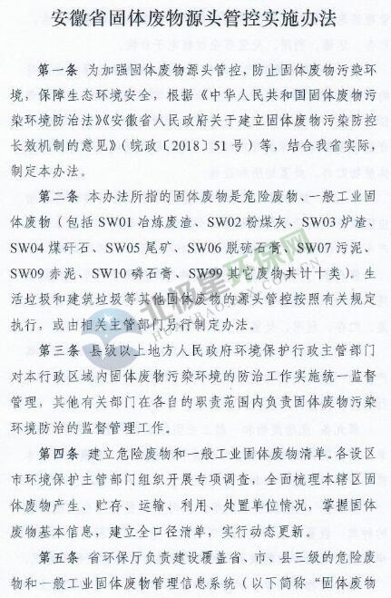 日前,安徽省發(fā)布《安徽省固體廢物源頭管控實施辦法》,詳情如下: