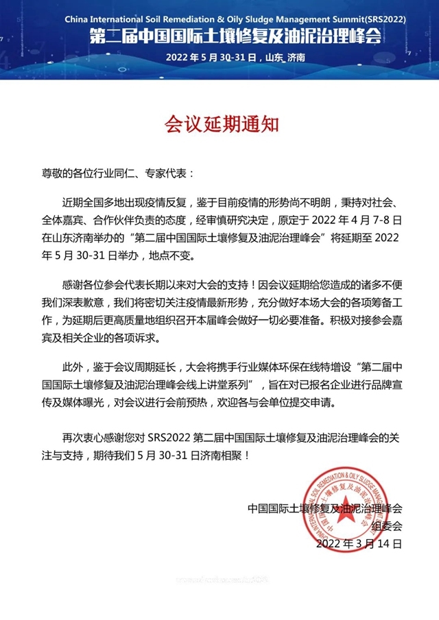 尊敬的各位行業(yè)同仁、專家代表: 鑒于近期疫情波及多個省市疫情形勢仍未明朗,秉持對社會、全體嘉賓、合作伙伴負責(zé)的態(tài)度,經(jīng)審慎研究決定,原定于 2022 年 5月 30-31日在山東濟南舉辦的“第二屆中國國際土壤修復(fù)及油泥治理峰會”將延期至 2022年8月(具體時間待定)舉辦,地...