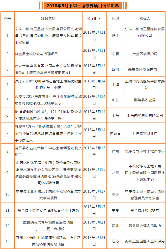 我國(guó)市場(chǎng)前景廣闊,很多也在如火如荼地進(jìn)行,5月下旬又有哪些項(xiàng)目呢?來(lái)源:CSER土壤修復(fù)平臺(tái)