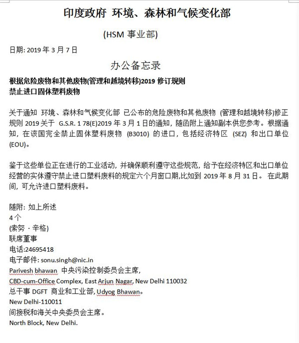 3月13日,本網(wǎng)報(bào)道了《印度宣布將全面禁止進(jìn)口固體塑料廢物》?!敖沼《拳h(huán)境、森林和氣候變化部發(fā)布一份官方聲明,稱印度政府已發(fā)布禁令,禁止印度(包括經(jīng)濟(jì)特區(qū)和出口型企業(yè))進(jìn)口固體塑料廢棄物。不過該聲明尚未透露這一禁令何時(shí)正式生效。”印度政府 環(huán)境、森林和氣候變化部(HSM事業(yè)部)日期:2019年3月...