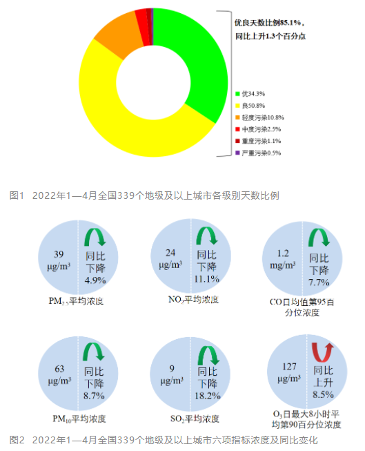 生態(tài)環(huán)境部5月18日向媒體通報(bào)了2022年4月和1—4月全國環(huán)境空氣質(zhì)量狀況。 環(huán)境空氣總體情況 4月,全國339個(gè)地級及以上城市平均空氣質(zhì)量優(yōu)良天數(shù)比例為89.0%,同比下降3.5個(gè)百分點(diǎn);PM2.5平均濃度為28微克/立方米,同比持平;PM10平均濃度為56微克/立方米,同比上升3....