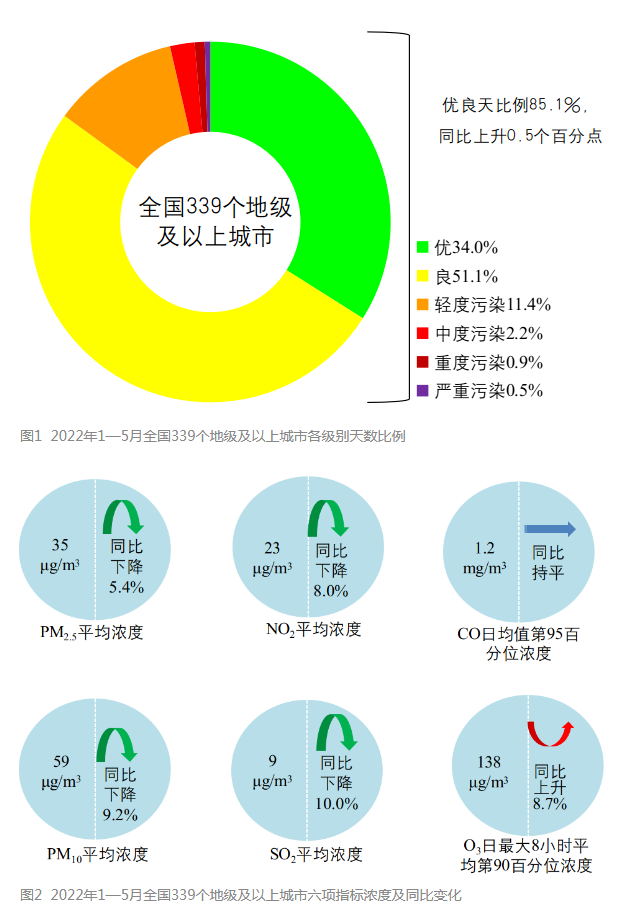 生態(tài)環(huán)境部今日向媒體通報(bào)了2022年5月和1—5月全國環(huán)境空氣質(zhì)量狀況。 環(huán)境空氣總體情況 2022年5月,全國339個(gè)地級及以上城市平均空氣質(zhì)量優(yōu)良天數(shù)比例為85.2%,同比下降2.6個(gè)百分點(diǎn);PM2.5平均濃度為22微克/立方米,同比持平;PM10平均濃度為45微克/立方米,同比下降...