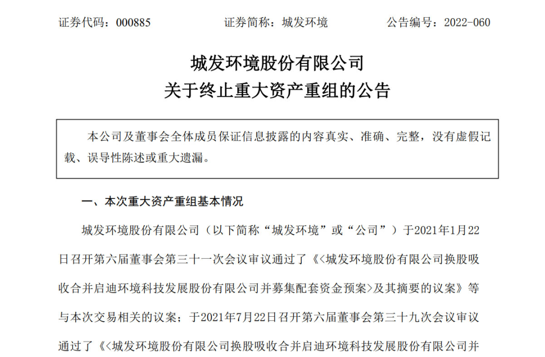 據(jù)公告顯示,終止本次重大資產重組的原因是城發(fā)環(huán)境自籌劃本次重大資產重組事項以來,嚴格按照相關法律法規(guī)的要求,與交易對方及其他相關雙方持續(xù)進行磋商與研討,并根據(jù)磋商結果積極推進相關盡職調查、審計、信息披露、內部決策等工作。鑒于本次重大重組方案論證歷時較長,相關市場環(huán)境較本次交易籌劃之初發(fā)生較大變化。經...