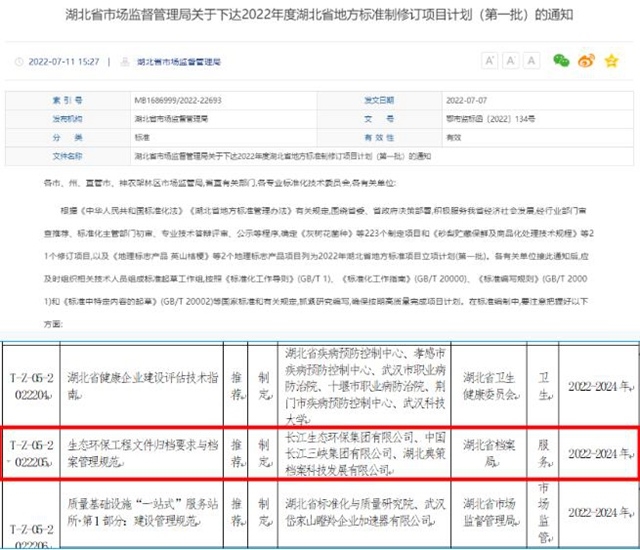 近日,湖北省市場監(jiān)督管理局印發(fā)關(guān)于下達2022年度湖北省地方標準制修訂項目計劃(第一批)的通知,長江環(huán)保集團牽頭主編的《生態(tài)環(huán)保工程文件歸檔要求與檔案管理規(guī)范》成功入選2022年湖北省地方標準項目立項計劃(第一批),這是公司成立以來首次牽頭主編的省級地方標準?!逗笔∈袌霰O(jiān)督管理局關(guān)于下達2022年...